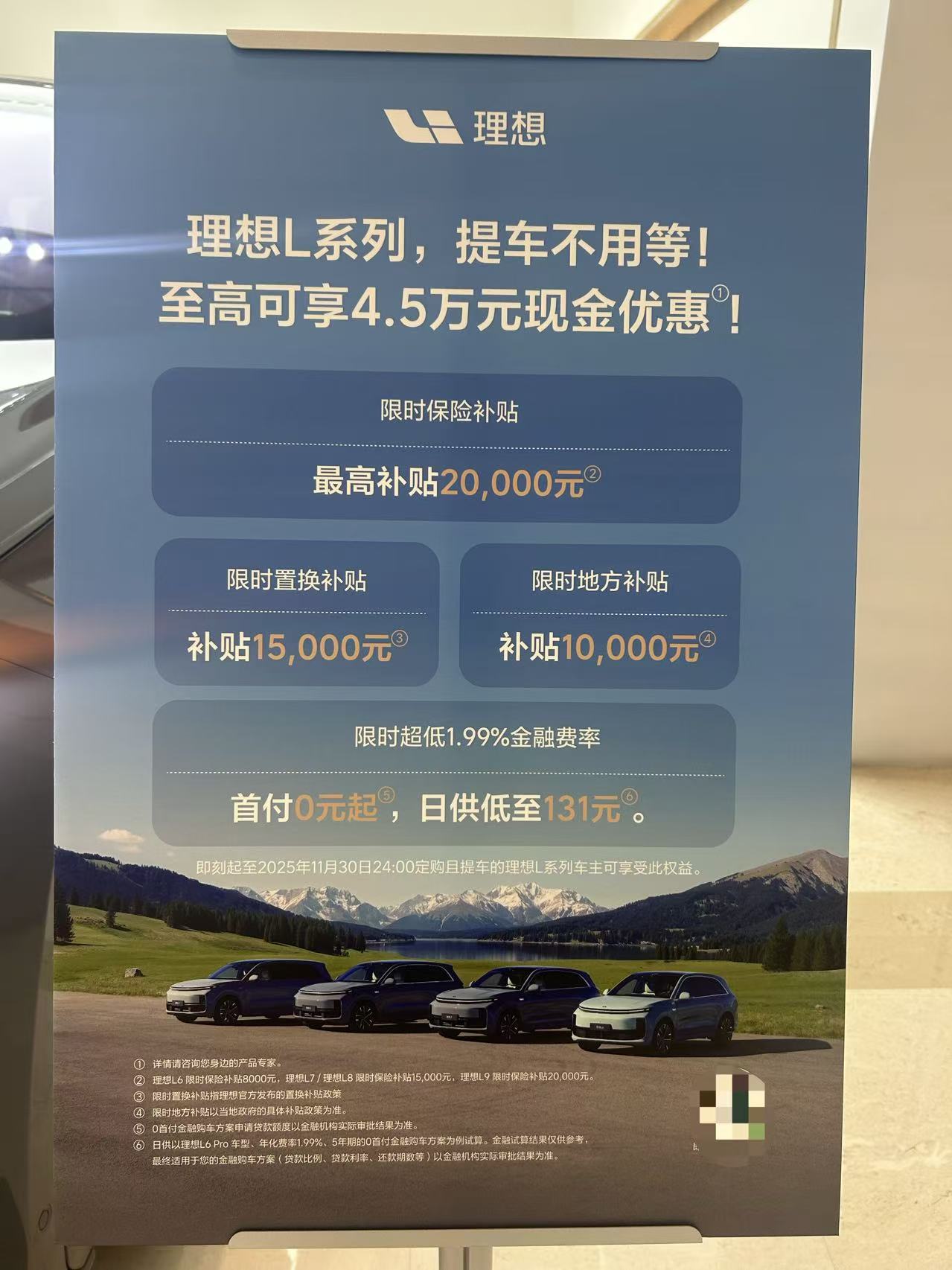 门店海报显示,理想L系列车型不仅提车无需等待,至高还可享受4.5万元的现金优惠,其中包含最高2万元的限时保险补贴、1.5万元的限时置换补贴以及1万元的限时地方补贴。
