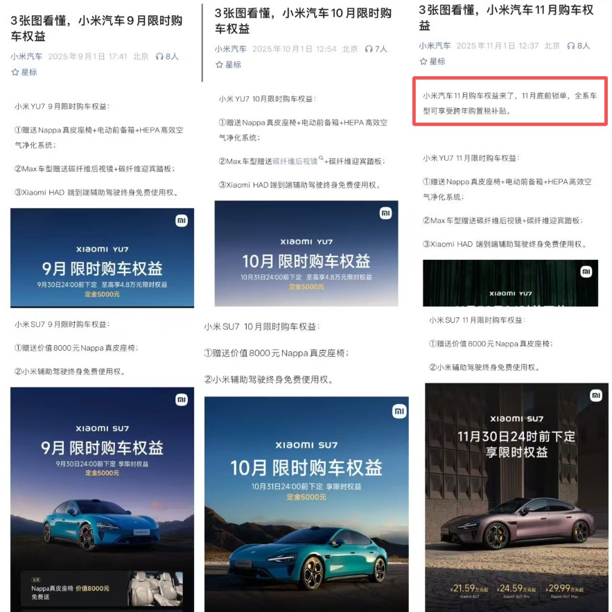以小米汽车为例,其在9月、10月和11月发布的限时购车权益中,除“11月底前锁单,全系车型可享受跨年购置税补贴”外,其它购车权益均相同。