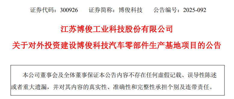 博俊科技(300926)11月10日公告称,公司全资子公司浙江博俊工业科技有限公司拟与杭州前进智造园管理办公室签署合作协议,计划在杭州市钱塘区建设博俊科技汽车零部件生产基地项目,项目总投资额拟为10亿元。