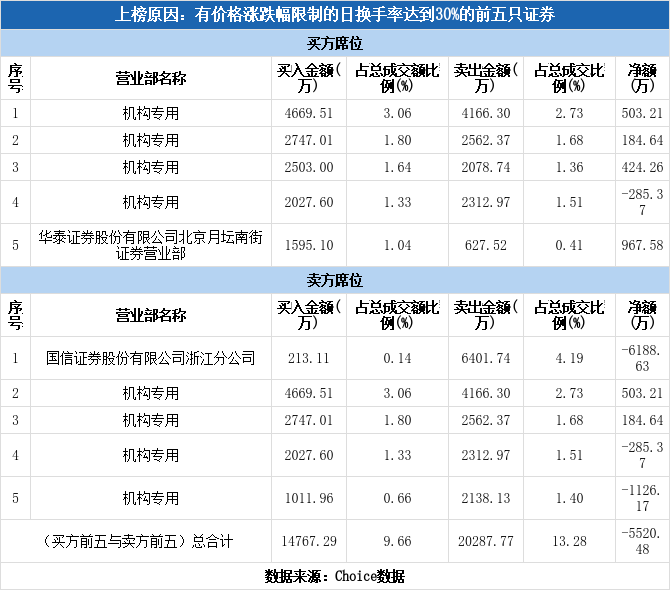 龙虎榜数据显示,今日共8个机构席位出现在龙虎榜单上,分别位列买一、买二、买三、买四、卖二、卖三、卖四、卖五,合计净卖出299.43万元,占龙虎榜净卖额的5.42%。