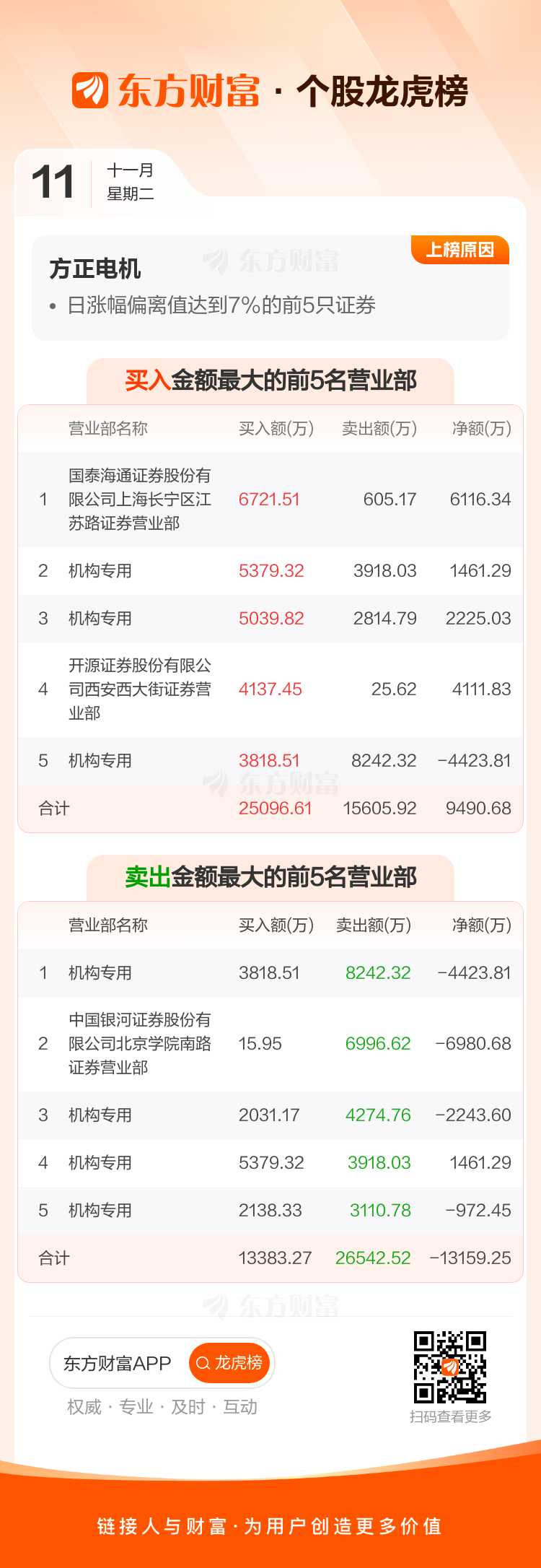 方正电机(002196)龙虎榜数据(11-11)