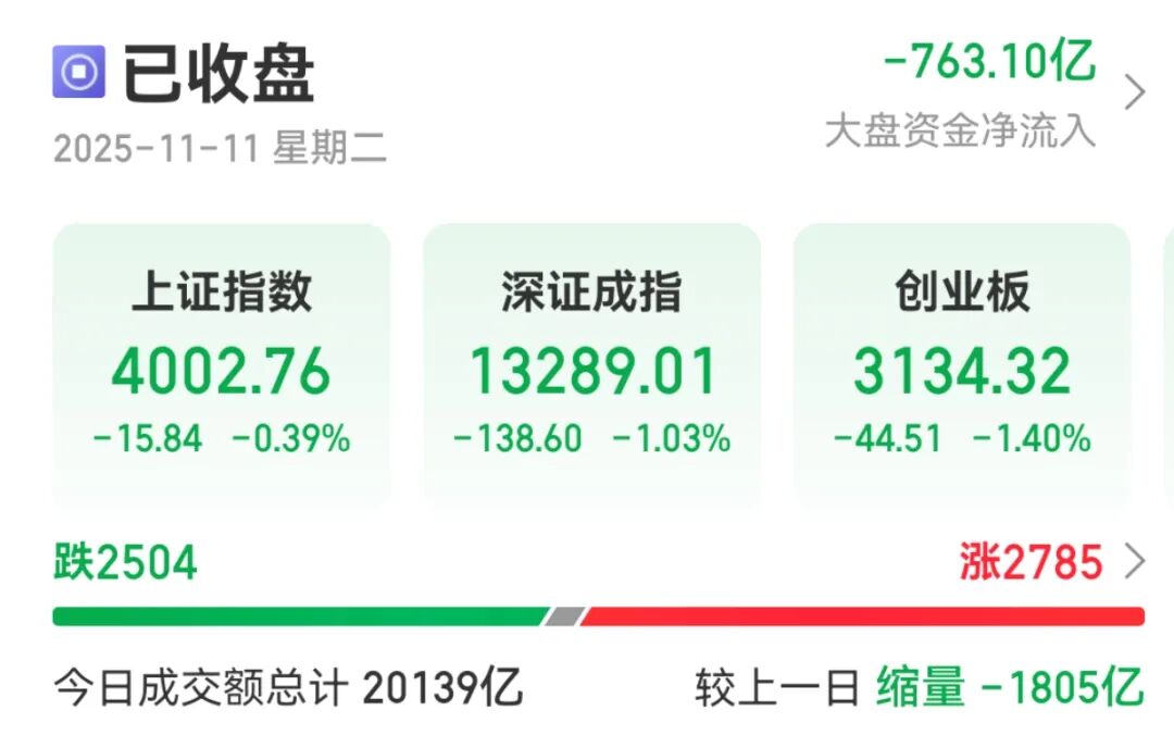 11月11日,A股震荡调整,三大指数高开低走。截至收盘,上证指数跌0.39%,深证成指跌1.03%,创业板指跌1.4%。