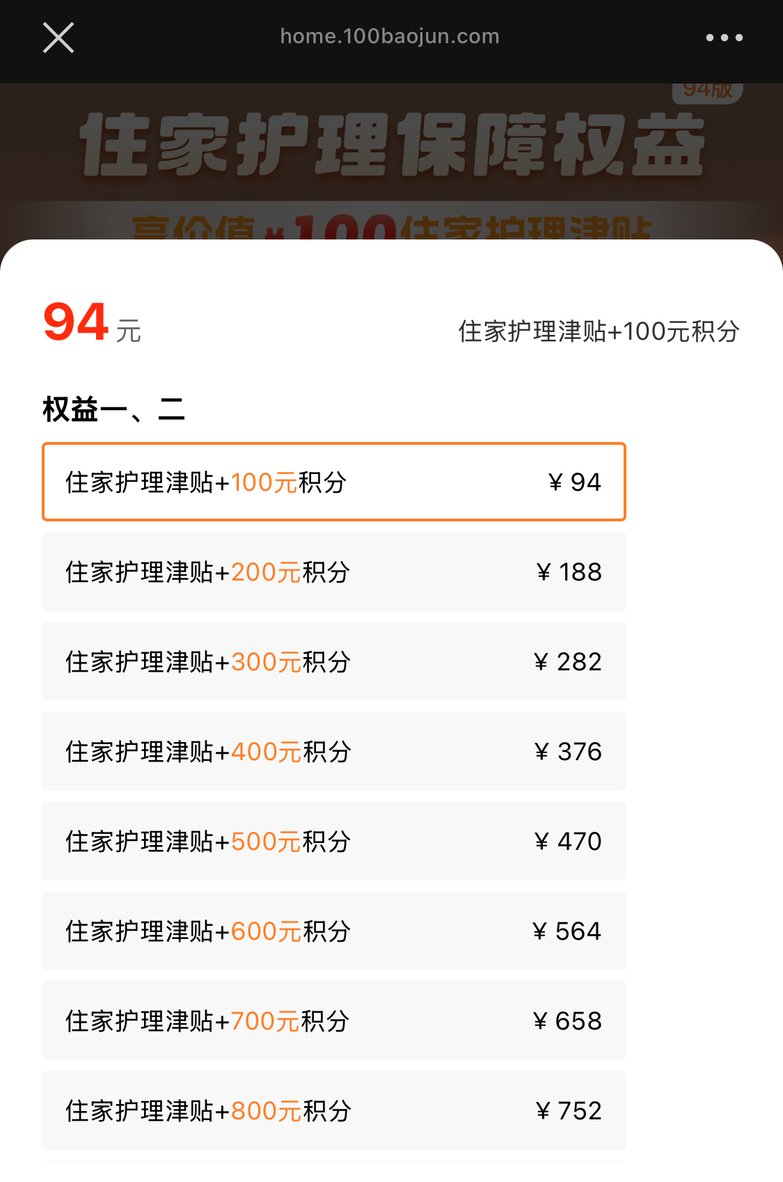 百保君的主页显示,一款名为住家护理保障权益(94)版的产品,保费最低94元,最高752元,可以享受住家护理津贴+不同数量的积分(购买日后60天-65天领取)。