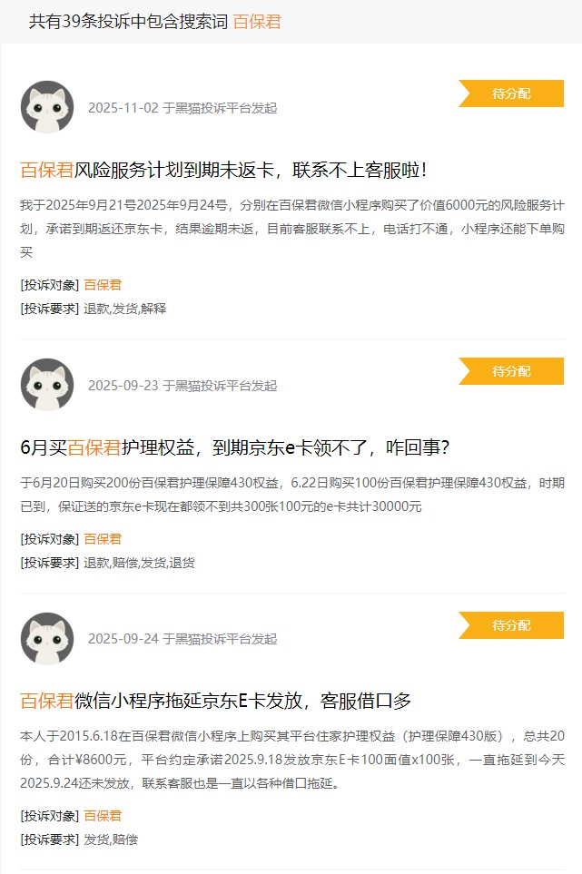 一用户称,其于2025年9月21日至9月24号,分别在百保君微信小程序购买了价值6000元的风险服务计划,承诺到期返还京东卡,结果逾期未返,目前客服联系不上,电话打不通,但小程序还能下单购买。