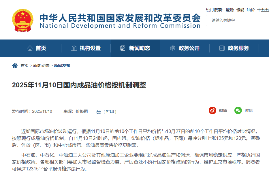 近期国际市场油价波动运行,根据11月10日的前10个工作日平均价格与10月27日的前10个工作日平均价格对比情况,按照现行成品油价格机制,自11月10日24时起,国内汽、柴油价格(标准品,下同)每吨分别上涨125元和120元。调整后,各省(区、市)和中心城市汽、柴油最高零售价格见附表。