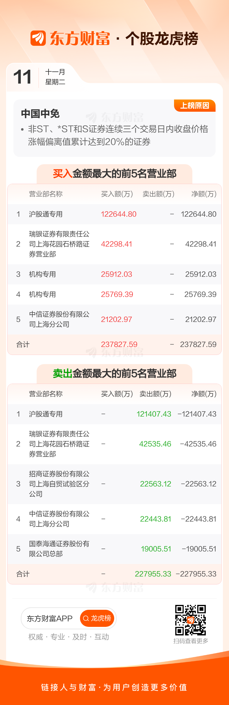 交易所2025年11月11日公布的交易公开信息显示,中国中免因成为非ST、*ST和S证券连续三个交易日内收盘价格涨幅偏离值累计达到20%的证券上榜。中国中免当日收报90.53元,涨跌幅4.19%,换手率7.08%,成交额123.20亿。异常期间11月7日至11月11日,期间涨幅20.16%,累计偏离值20.29%,区间成交额260.36亿。