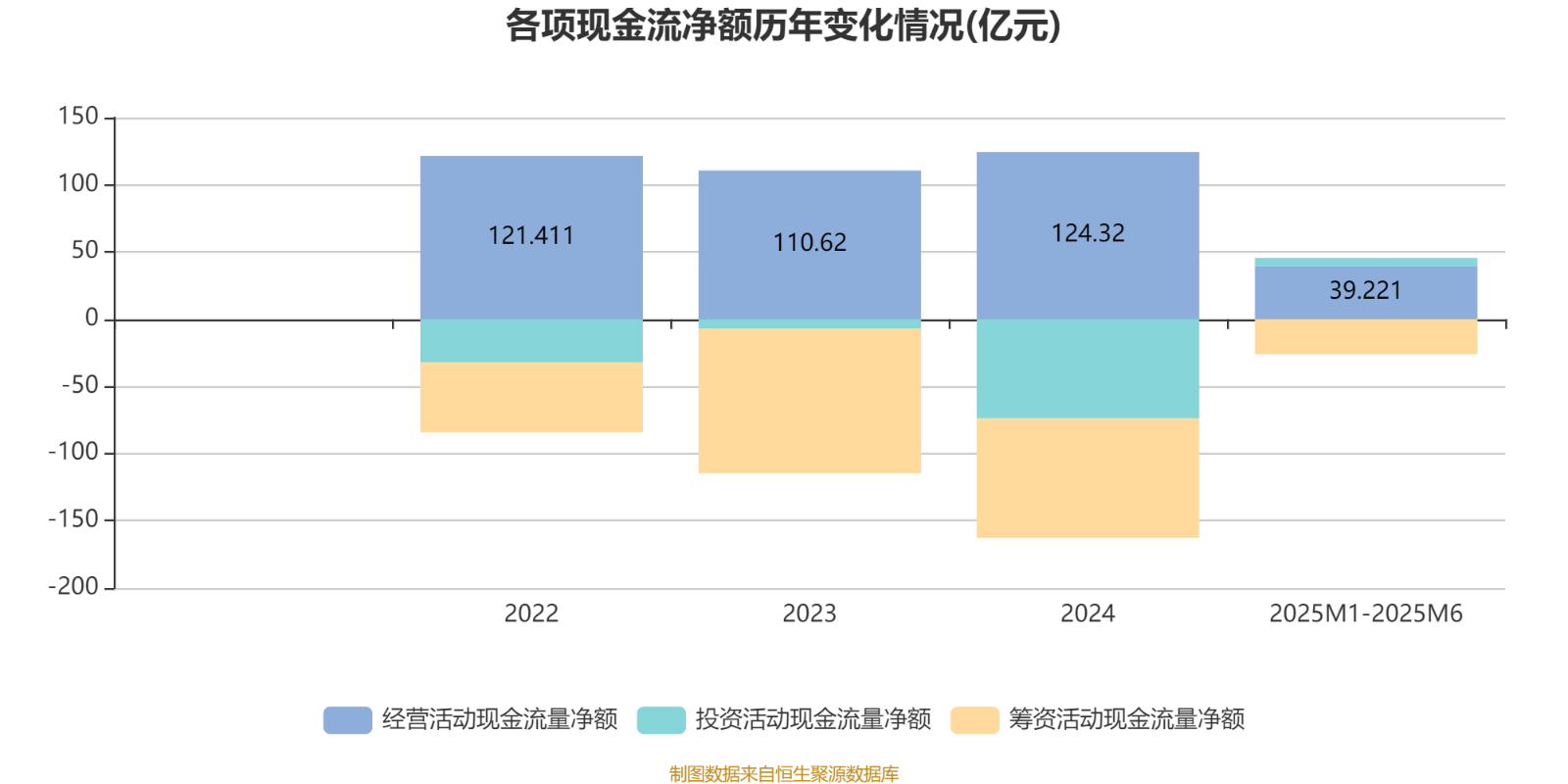 2025年1月至6月,公司经营活动现金流净额为39.22亿元,同比下降53.83%;筹资活动现金流净额-26.09亿元,同比减少8.2亿元;投资活动现金流净额6.31亿元,上年同期为-66.3亿元。