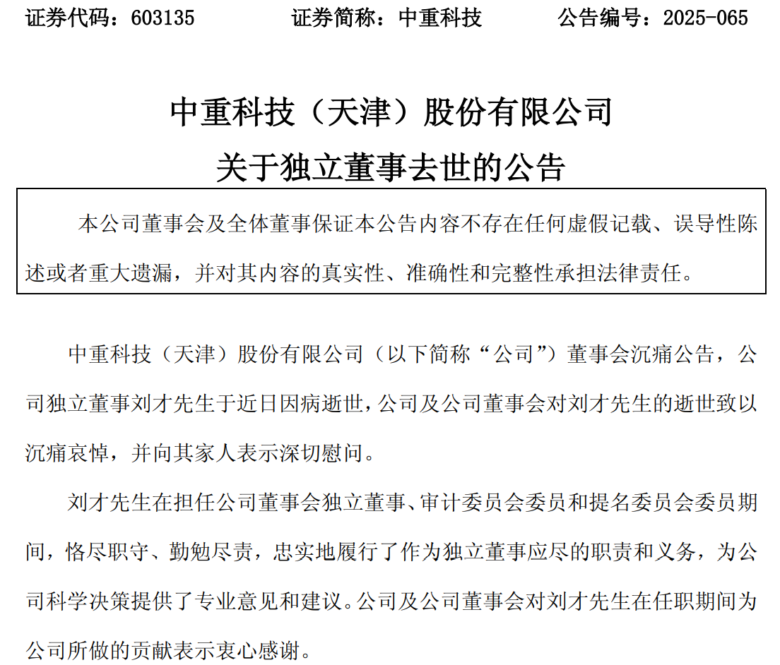 11月11日晚间,中重科技(603135)发布公告称,公司独立董事刘才先生于近日因病逝世,公司及公司董事会对刘才先生的逝世致以沉痛哀悼,并向其家人表示深切慰问。