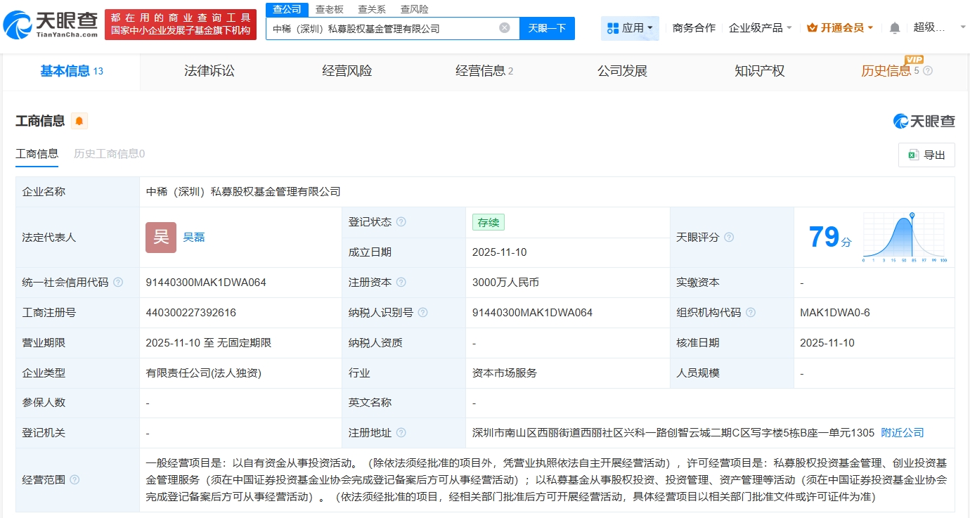 南方财经11月11日电,天眼查工商信息显示,近日,中稀(深圳)私募股权基金管理有限公司成立,法定代表人为吴磊,注册资本3000万人民币,经营范围包括以自有资金从事投资活动、私募股权投资基金管理、创业投资基金管理服务等。股东信息显示,该公司由中国稀土集团创新科技有限公司全资持股。