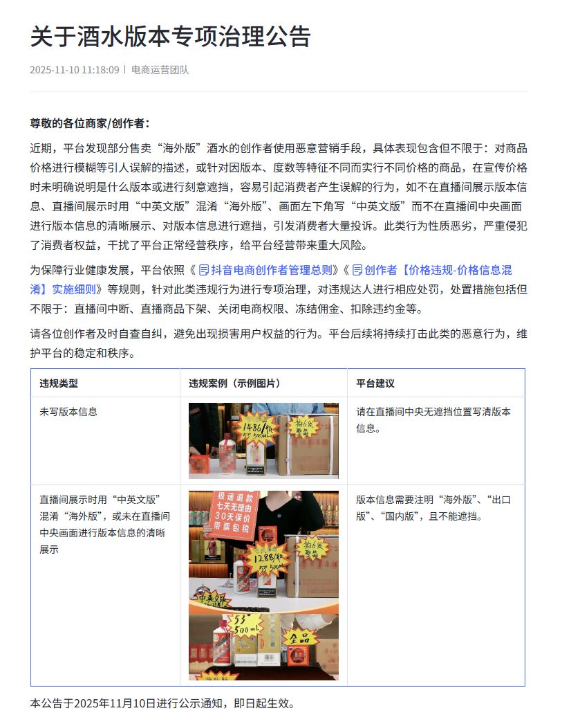 11月10日,抖音电商团队发布《关于酒水版本专项治理公告》,称近期平台发现部分售卖“海外版”酒水的创作者使用恶意营销手段,引发消费者大量投诉。此类行为性质恶劣,严重侵犯了消费者权益,干扰了平台正常经营秩序,给平台经营带来重大风险。