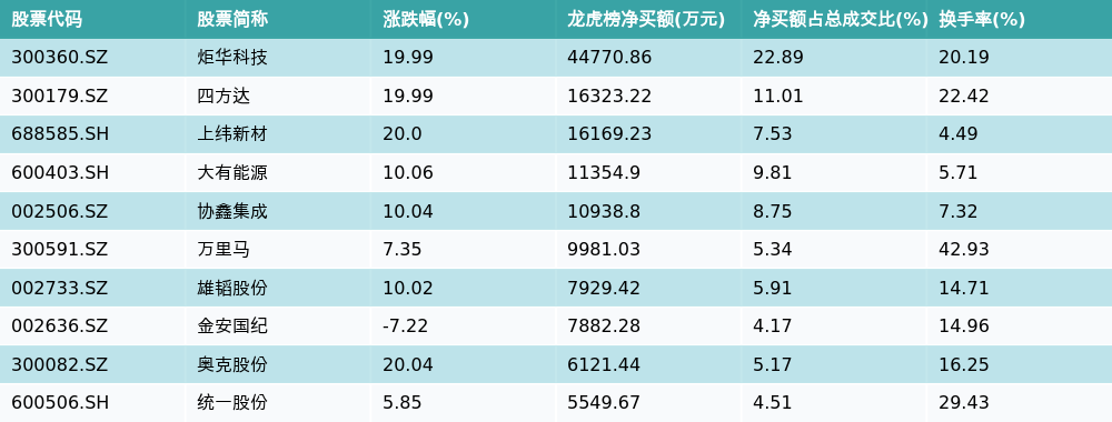 南财智讯11月11日电,南财金融终端数据显示,因当日异动登上龙虎榜的个股中,资金净买入最多的前三位分别是炬华科技(300360.SZ)、四方达(300179.SZ)与上纬新材(688585.SH)。其中排名第一的炬华科技净买额达4.48亿元,占总成交金额的22.89%。炬华科技当日收盘上涨19.99%,换手率为20.19%,净买入额前10个股详情见下图: