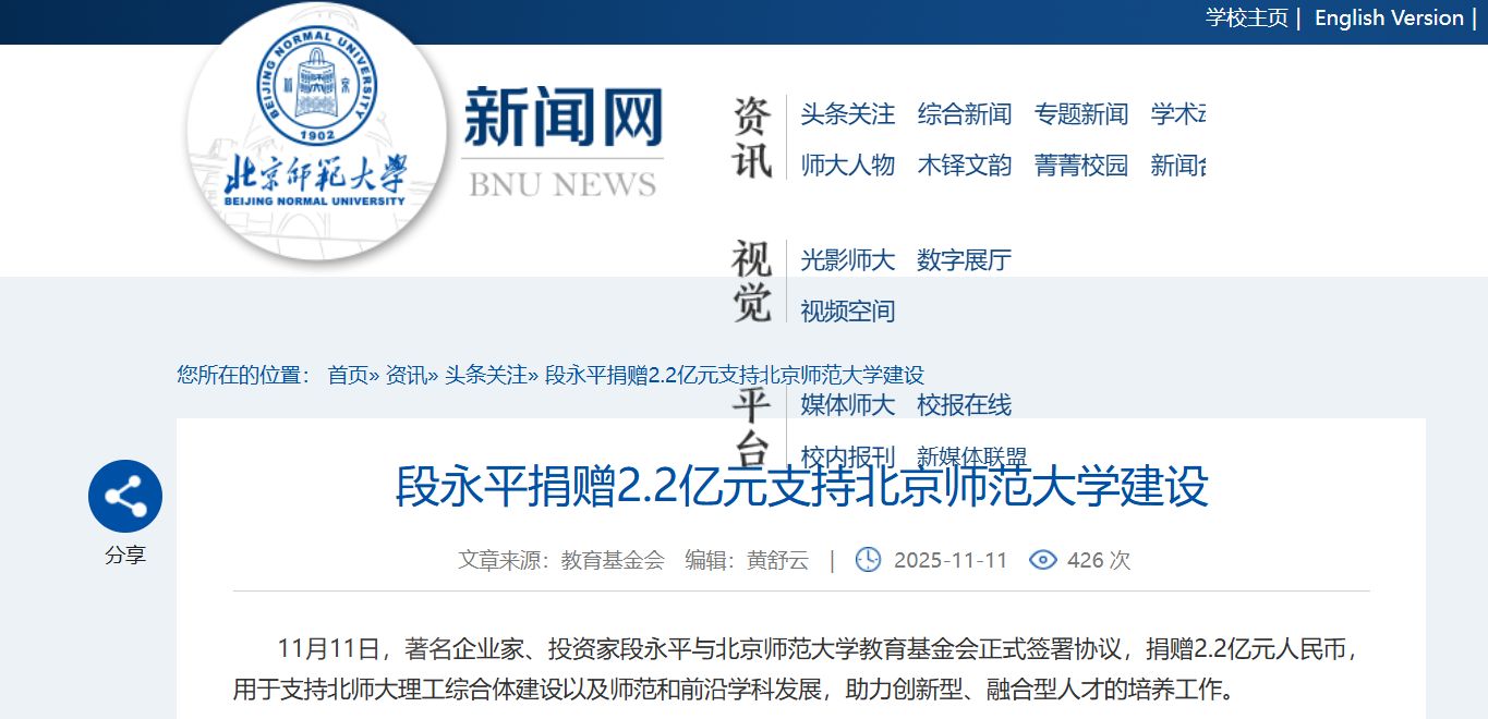 北京师范大学官网11月11日发布消息称,著名企业家、投资家段永平与北京师范大学教育基金会正式签署协议,捐赠2.2亿元人民币,用于支持北师大理工综合体建设以及师范和前沿学科发展,助力创新型、融合型人才的培养工作。