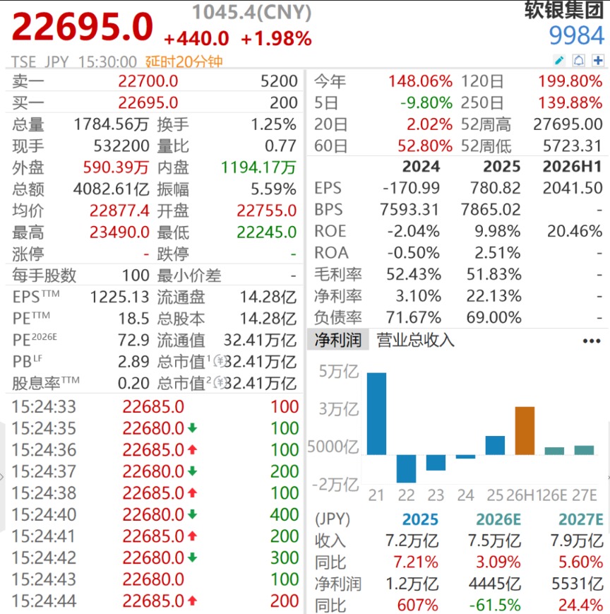 财富暴涨的背后,是软银集团市值的狂飙:自4月以来,其股价从5700日元/股的低点一路飙升至25000日元/股,涨幅超338%,市值一度突破38万亿日元(约合1.7万亿元人民币),成为日经225指数中涨幅最惊人的成份股。