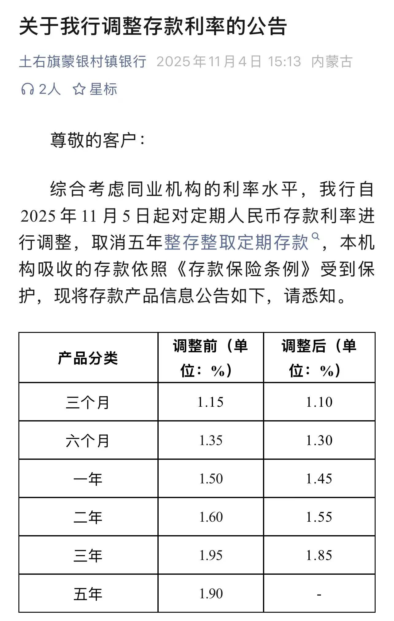 在存款利率“跌跌不休”之后,有中小银行开始下架五年期存款产品。近日,土右旗蒙银村镇银行通过官方微信公众号发布了《关于调整我行存款利率的公告》。该行表示,综合考虑同业机构的利率水平,自2025年11月5日起,对定期人民币存款利率进行调整,取消五年期整存整取定期存款。业内专家认为,未来商业银行仍将继续下调存款利率,可能也会有更多的银行跟进下架长期限存款产品。
