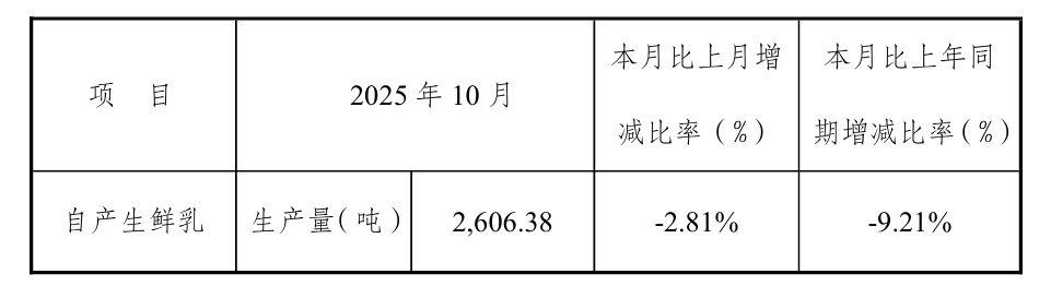 11月11日盘后,西部牧业(300106)公布养殖业务月度生产情况。该公司10月自产生鲜乳生产量为2606.38吨,同比下降9.21%,环比下降2.81%。