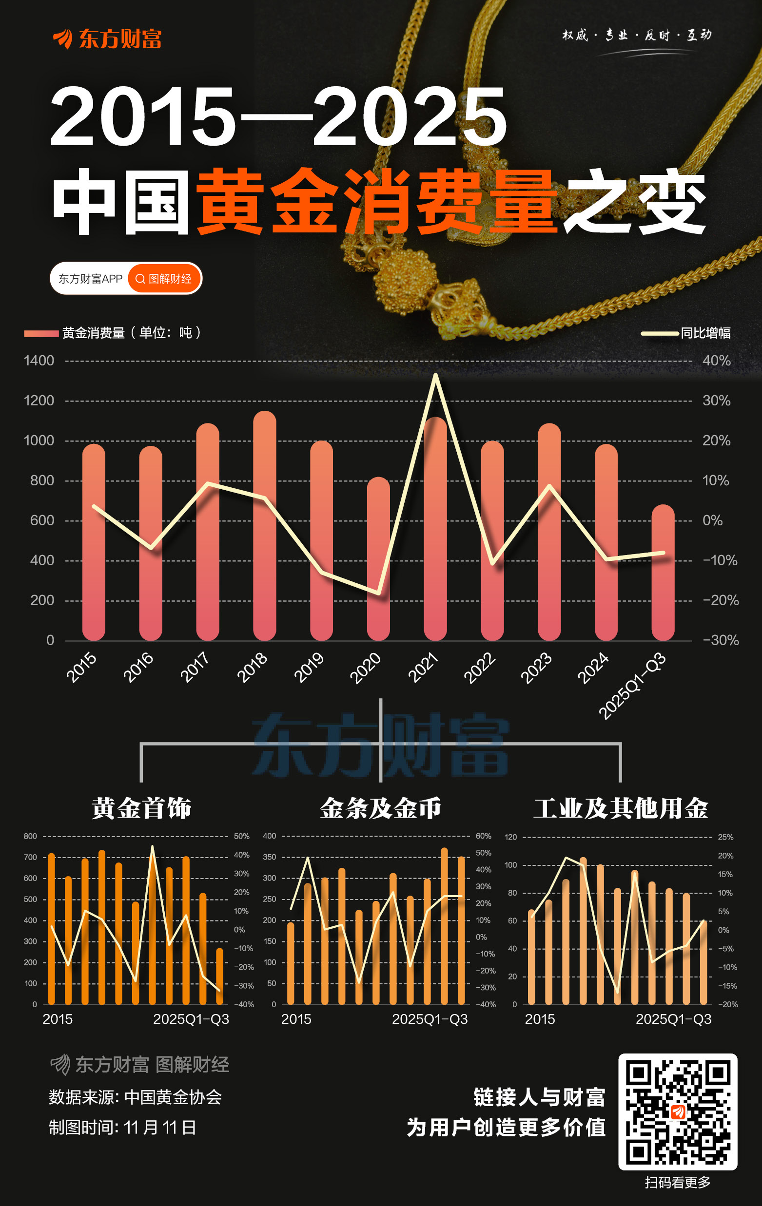 11月10日,中国黄金协会发布的数据显示,2025年前三季度,我国黄金消费量682.73吨,同比下降7.95%。其中,下降最多的是消费黄金首饰,前三季度同比下降32.50%。但不同品类表现分化显著。同期,金条、金币、工业及其他用金都出现不同程度的增长,尤其是金条及金币同比增长24.55%。