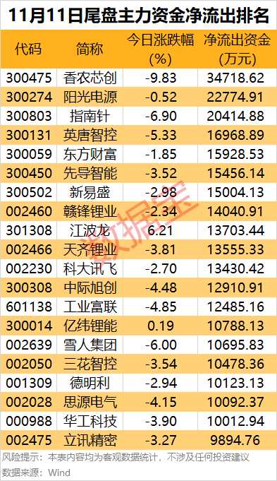 阳光电源和指南针尾盘主力资金净流出均超2亿元。消息面上,指南针10月31日披露了关于终止2022年度向特定对象发行股票事项并撤回申请文件的公告。近日公司公告,深交所已于2025年11月6日出具终止审核决定。本次终止不影响公司正常生产经营,亦不构成对股东利益的重大损害。