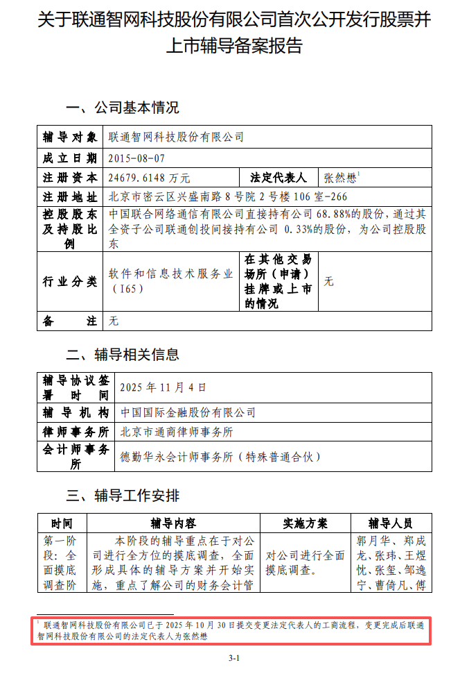 据辅导备案报告,智网科技于2025年10月30日提交变更法定代表人的工商流程,变更完成后联通智网科技股份有限公司的法定代表人为张然懋。天眼查APP显示,此前,联通智网的法定代表人、董事长为赵越女士。