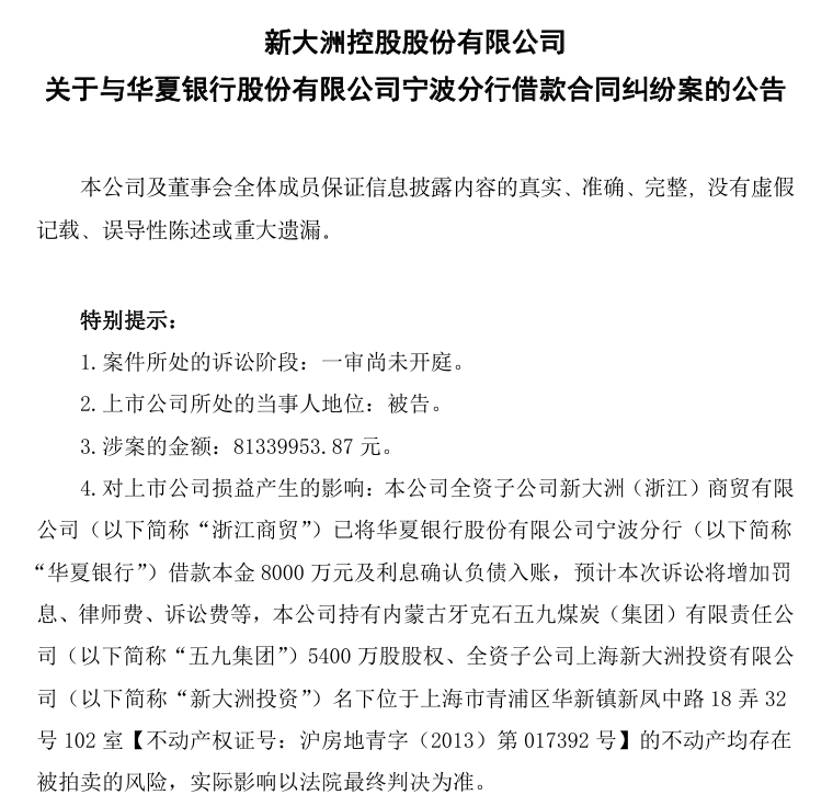 11月11日,新大洲A(000571)发布公告,公司的全资子公司浙江商贸因与华夏银行宁波分行的借款合同纠纷被起诉,案件尚未开庭,涉案金额为8134万元。