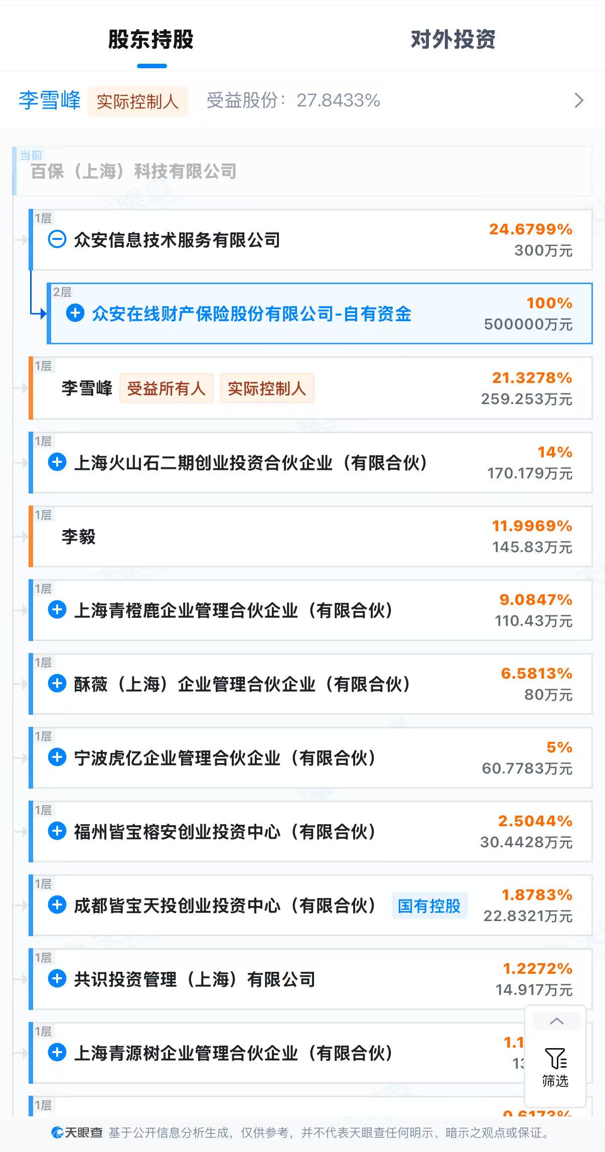 天眼查显示,百保公司注册资本1215.5664万人民币,并已于2022年完成了Pre-A轮,交易金额5000万人民币。股东方面,大股东众安科技持有百保公司24.6799%股权。该公司目前的实控人为公司董事长、总经理李雪峰,其直接持股21.3278%,间接持股6.5155%。