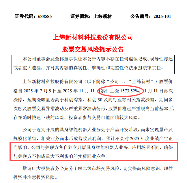 11月11日晚间,上纬新材公告,公司股票价格自2025年7月9日至2025年11月11日累计上涨1573.52%,11月11日再次涨停,短期涨幅显著高于科创综指、科创50及同行业等相关指数涨幅,期间多次触及股票交易异常波动及严重异常波动情形,股票价格已严重脱离当前基本面,存在随时快速下跌的风险。