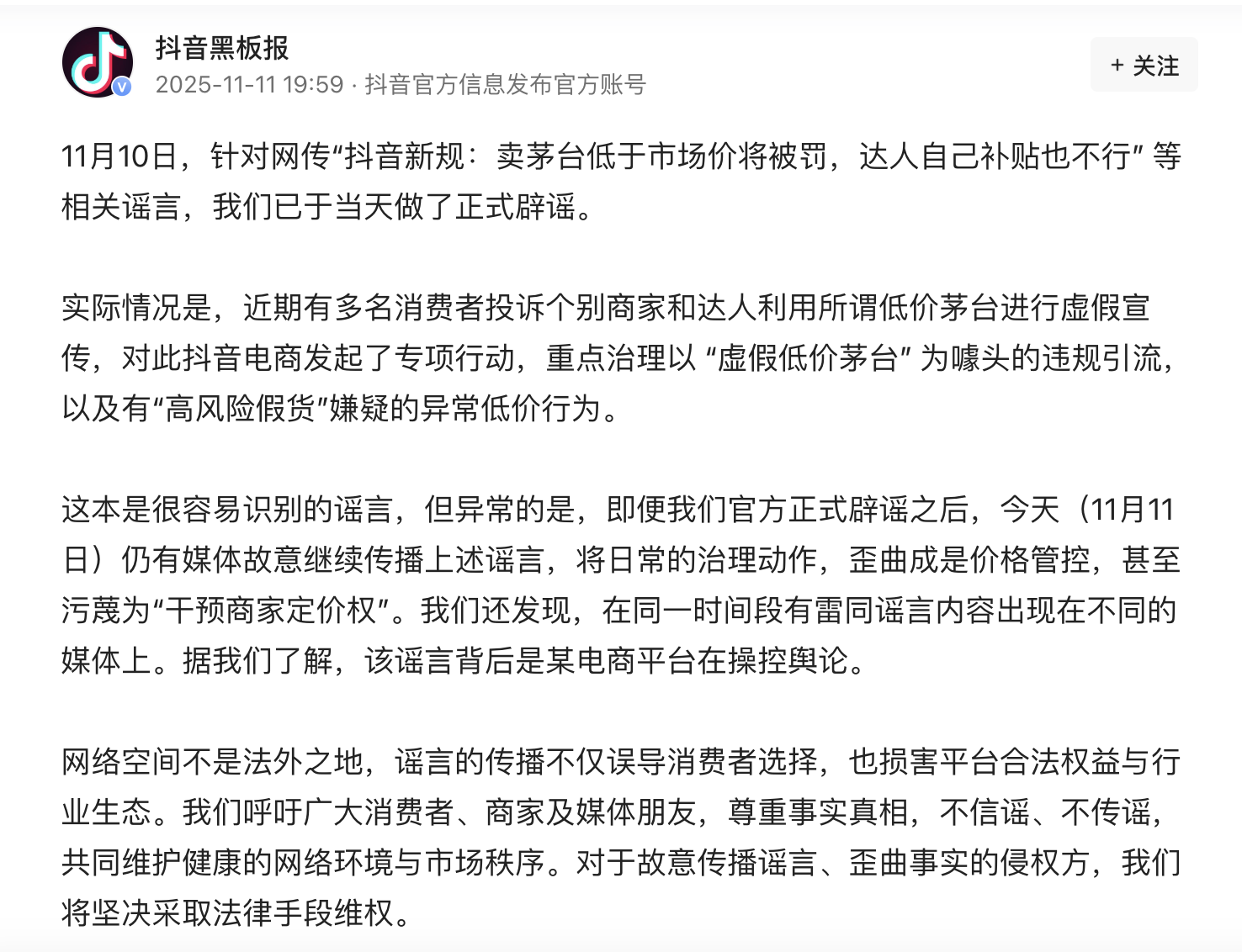 人民财讯11月11日电,抖音官方晚间发布声明称,针对网传“抖音新规:卖茅台低于市场价将被罚,达人自己补贴也不行” 等相关谣言,抖音已于11月10日做了正式辟谣。实际情况是,近期有多名消费者投诉个别商家和达人利用所谓低价茅台进行虚假宣传,对此抖音电商发起了专项行动,重点治理以 “虚假低价茅台”为噱头的违规引流,以及有“高风险假货”嫌疑的异常低价行为。对于故意传播谣言、歪曲事实的侵权方,抖音将坚决采取法律手段维权。