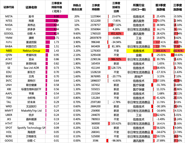 13F文件显示,景林资产美股持仓的前十大重仓股分别为脸书母公司Meta、网易、英伟达、拼多多、谷歌、满帮集团、富途控股、阿里巴巴、Nebius Group和奇富科技,合计持股市值为36.37亿美元,中概股依旧占主导。