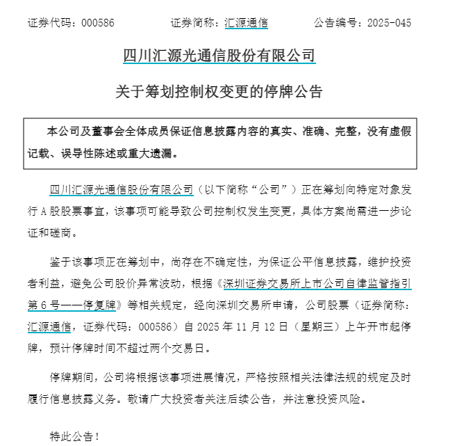 汇源通信(000586)11月11日公告,公司正在筹划向特定对象发行A股股票事宜,该事项可能导致公司控制权发生变更,具体方案尚需进一步论证和磋商。公司股票自11月12日开市起停牌,预计停牌不超过两个交易日。