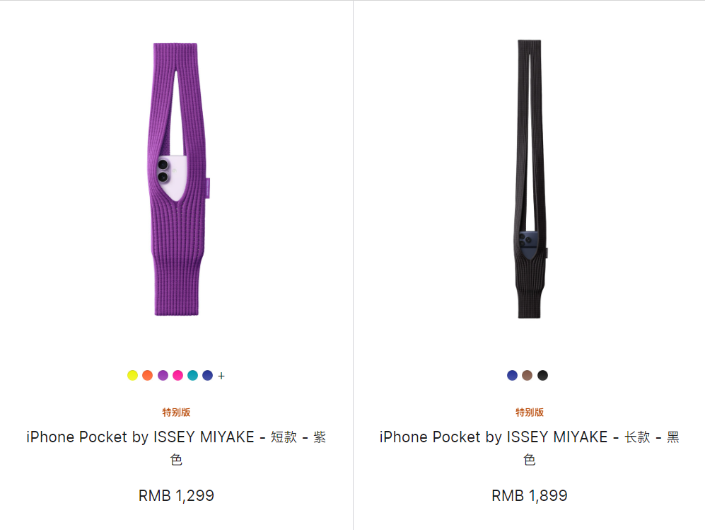 iPhone Pocket短带款提供8种色彩外观:柠檬色、柑橘色、紫色、粉色、孔雀绿色、宝石蓝色、肉桂色和黑色,售价1299元;长带款提供3种色彩外观:宝石蓝色、肉桂色和黑色,售价1899元。用户可使用不同颜色的 iPhone Pocket 和 iPhone 打造个性化色彩搭配。