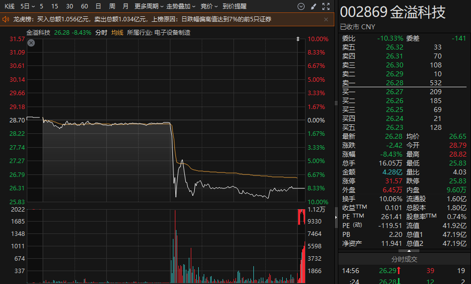 当日,该股早盘交易平稳,股价围绕开盘价28.79元/股窄幅波动。然而,午后开盘,股价毫无征兆地开始大幅跳水。13时,金溢科技股价跌幅为1.29%,到13时05分,股价跌幅达9.55%,成交量急剧放大。最终金溢科技收报26.28元/股,全天换手率达10.06%,显示市场抛压较大。