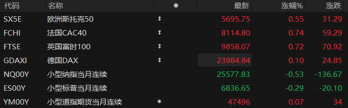 周一盘前,美股三大股指期货涨跌不一,欧洲主要指数普遍上涨。截至发稿,纳斯达克100指数期货跌0.53%,标普500指数期货跌0.29%,道指期货涨0.07%。