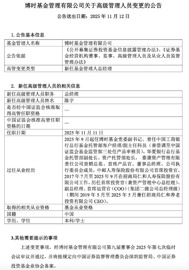 11月11日晚间,博时基金发布高级管理人员变更公告,经博时基金管理有限公司第九届董事会2025年第七次临时会议审议并通过,博时基金党委副书记陈宇正式接任公司总经理。
