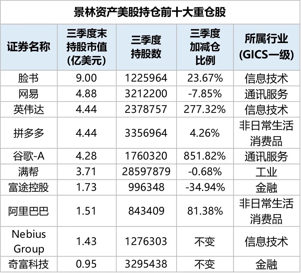 美国证券交易委员会公开资料显示,截至今年三季度末,景林资产美股持仓的前十大重仓股分别为脸书母公司META、网易、英伟达、拼多多、谷歌-A、满帮、富途控股、阿里巴巴、Nebius Group和奇富科技。