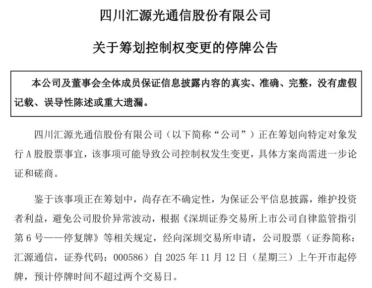 11月11日,汇源通信(000586)发布公告,公司正在筹划向特定对象发行A股股票事宜,该事项可能导致公司控制权发生变更,具体方案尚需进一步论证和磋商。鉴于该事项正在筹划中,存在不确定性,公司申请自2025年11月12日上午开市起停牌,预计停牌时间不超过两个交易日。