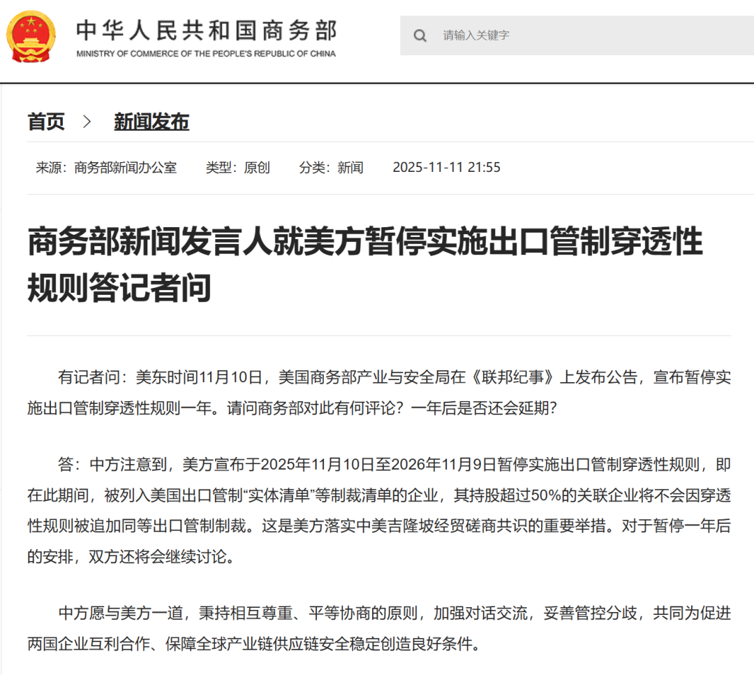 有记者问:美东时间11月10日,美国商务部产业与安全局在《联邦纪事》上发布公告,宣布暂停实施出口管制穿透性规则一年。请问商务部对此有何评论?一年后是否还会延期?