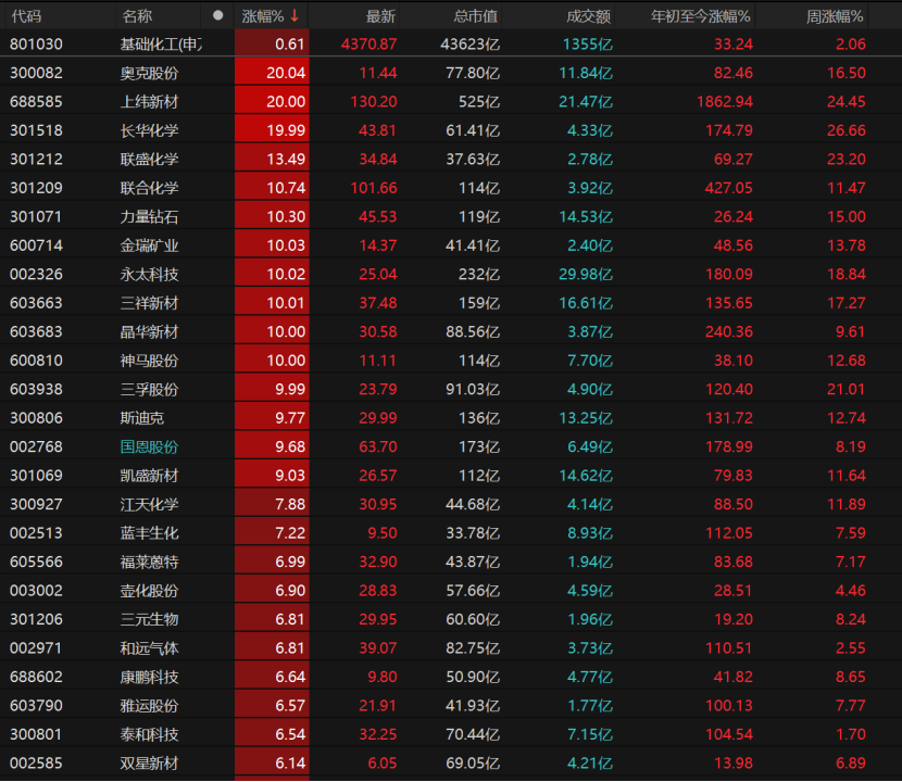 9只基础化工个股涨停,奥克股份、上纬新材、长华化学“20cm”涨停,联盛化学、联合化学、力量钻石涨幅均超过10%,金瑞矿业、永太科技、三祥新材、晶华新材、神马股份、三孚股份均涨停。