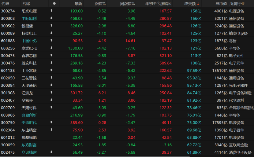 市场共计2785只个股收涨,涨停股82只;2504只个股收跌,跌停股6只。日成交额不低于100亿元的个股仅有8只,其中7只科技股收跌,中际旭创、特变电工、寒武纪-U、胜宏科技跌幅均超过4%,新易盛跌近3%,香农芯创收跌9.83%报176.58元/股,中国中免则收涨4.19%报90.53元/股。