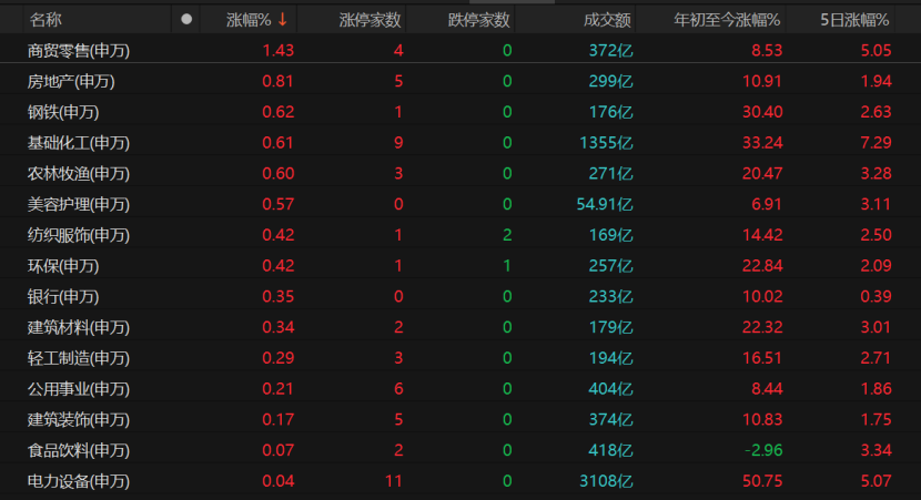 大消费板块延续昨日升势,但受大盘拖累,涨幅明显收窄。商贸零售板块领涨,中信金属、浙江东日、农产品、东百集团涨停,汇嘉时代、中百集团涨势不错。华侨城A、顺发恒能、大名城等房地产个股涨停,方大炭素涨停,马钢股份涨逾8%。