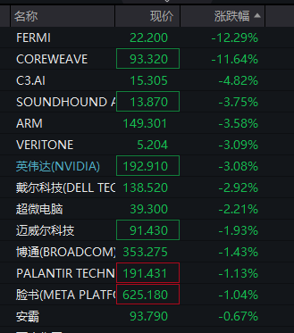 芯片股亦普遍走低,美光科技跌近4%,ARM、拉姆研究等跌超3%。