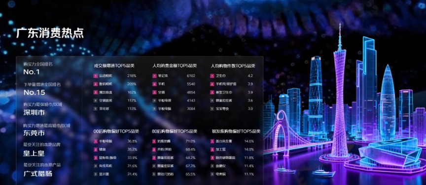 京东11.11消费情况显示,在本次大促期间,广东省依然是购买力排名第一的省份,稳坐全国消费“C位”。数据显示,广东省内,深圳市是购买力最强的城市,东莞市的购买力增速最高。同时,知名的“广字头”品牌众多,“皇上皇”是最受关注的本地品牌,“广式腊肠”是最受关注的本地产品。