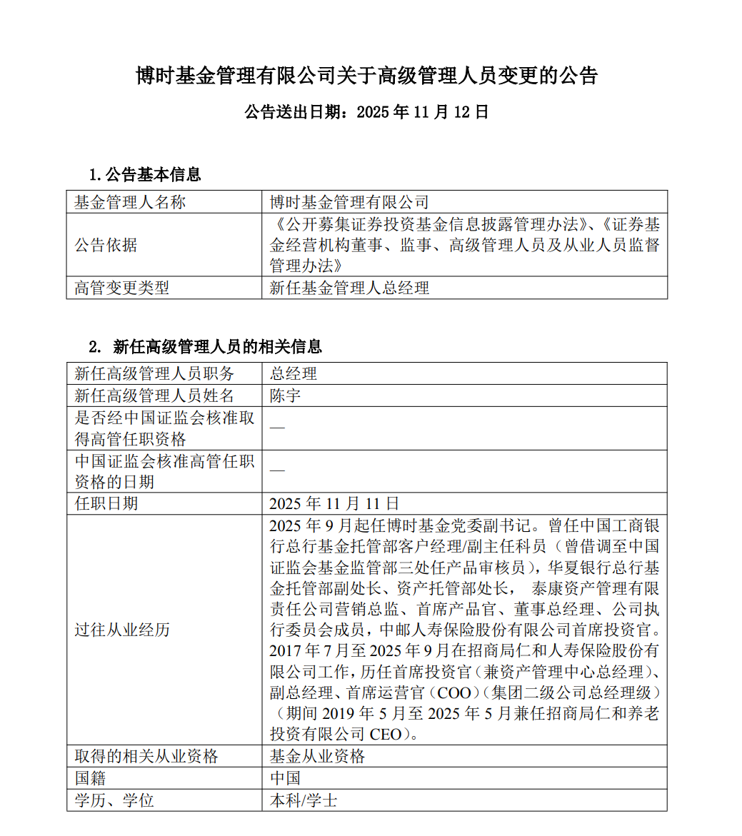 11 月11 日晚间,博时基金发布高级管理人员变更公告,党委副书记陈宇正式接任总经理。加之此前张东任博时基金董事长,标志着这家管理规模超1.8万亿元的头部机构完成新一轮掌舵人换届。