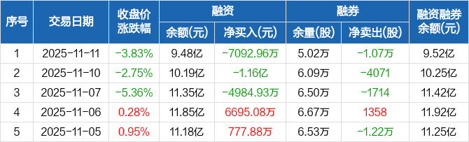 融资方面,当日融资买入9843.01万元,融资偿还1.69亿元,融资净偿还7092.96万元,连续3日净偿还累计2.37亿元。融券方面,融券卖出1.06万股,融券偿还2.13万股,融券余量5.02万股,融券余额486.97万元。融资融券余额合计9.52亿元。