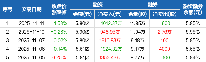 融资方面,当日融资买入3377.8万元,融资偿还4390.17万元,融资净偿还1012.37万元。融券方面,融券卖出300股,融券偿还1200股,融券余量11.85万股,融券余额511.33万元。融资融券余额合计5.85亿元。