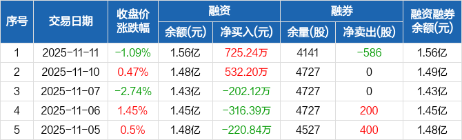 博众精工融资融券信息显示,2025年11月11日融资净买入725.24万元;融资余额1.56亿元,较前一日增加4.88%。