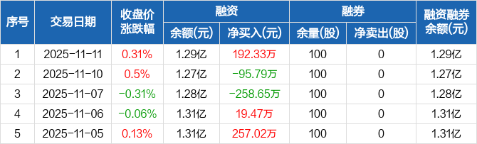 融资方面,当日融资买入695.69万元,融资偿还503.35万元,融资净买入192.33万元。融券方面,融券卖出0股,融券偿还0股,融券余量100股,融券余额1606元。融资融券余额合计1.29亿元。