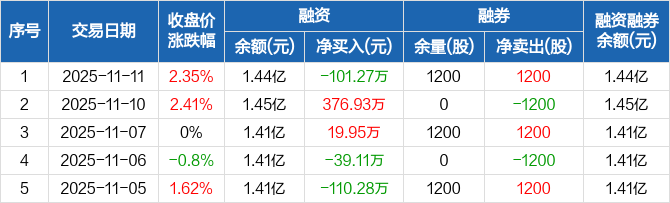 融资方面,当日融资买入1645.59万元,融资偿还1746.86万元,融资净偿还101.27万元。融券方面,融券卖出1200股,融券偿还0股,融券余量1200股,融券余额3132元。融资融券余额合计1.44亿元。