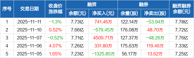 融资方面,当日融资买入6752.33万元,融资偿还6010.86万元,融资净买入741.46万元。融券方面,融券卖出5700股,融券偿还54.51万股,融券余量122.14万股,融券余额462.92万元。融资融券余额合计7.78亿元。