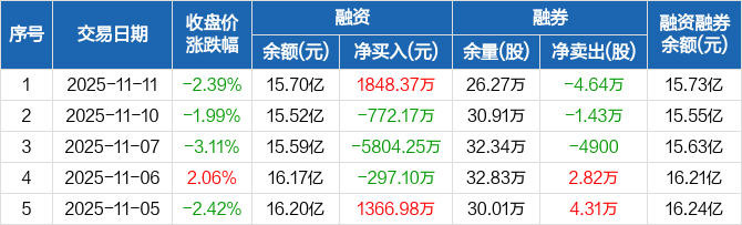 融资方面,当日融资买入8198.44万元,融资偿还6350.07万元,融资净买入1848.37万元。融券方面,融券卖出3.16万股,融券偿还7.8万股,融券余量26.27万股,融券余额290.02万元。融资融券余额合计15.73亿元。