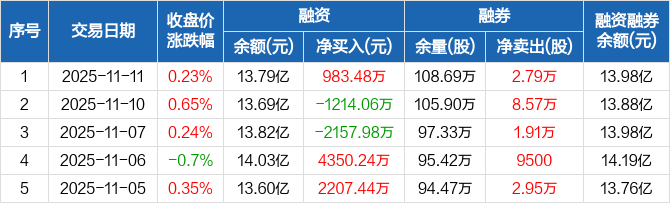 成都银行:融资净买入983.48万元,融资余额13.79亿元(11-11)