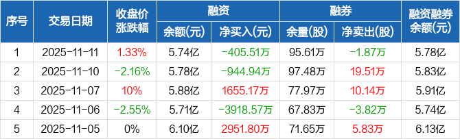 融资方面,当日融资买入8135.18万元,融资偿还8540.69万元,融资净偿还405.51万元。融券方面,融券卖出3.58万股,融券偿还5.45万股,融券余量95.61万股,融券余额437.89万元。融资融券余额合计5.78亿元。